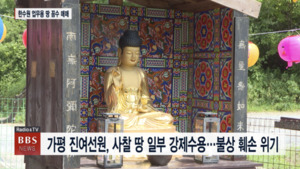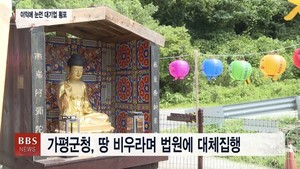 < 앵커 >경기도 가평의 한 사찰 땅이 인근 대기업 연구시설의 사실상 진입로에 강제 수용돼, 불상이 반쪽 날 위기에 처하는 등 심각한 수행환경 침해를 겪고 있습니다.대기업이 이익 추구에만 눈이 멀어 공권력까지 앞세워 힘없는 사찰 재산을 뺏으려 한다는 지적이 나오고 있습니다. 배재수 기자가 현장을 취재했습니다. < 리포터 >북한강 청평호의 비경을 품은 경기도 가평의 수행도량 진여선원.최근 진여선원의 불상이 반쪽으로 쪼개질 위기에 처했습니다.인근에 들어선 GS 칼텍스 인재개발원의 사실상 진입로 공사를 위해 가평군청의 사찰 땅 일부 강제