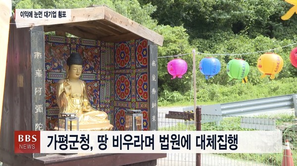 제 뒤로 보이는 아미타불상은 가평군청의 대체 집행으로 반쪽으로 나뉠 위기에 처했다가 법원의 중지 결정에 따라 가까스로 보존됐습니다.