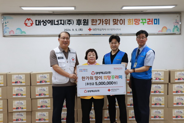 대성에너지(대표이사 박문희)는 5일 대한적십자사 대구지사(회장 박명수) 1층 강당에서 민족의 명절인 한가위를 앞두고 대구 중구 취약계층을 위해 ‘한가위 맞이 희망꾸러미’를 제작하고 이를 100세대에게 전달했다고 밝혔습니다.