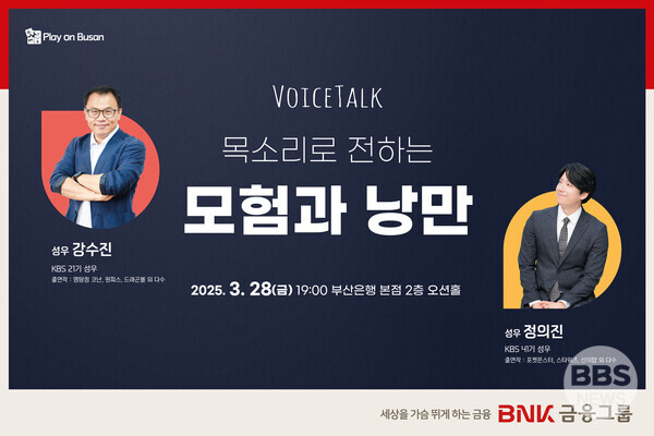 오는 28일(금) 오후 7시 부산은행 본점 2층 오션홀에서 열리는 이번 토크콘서트에서는 ‘목소리로 전하는 모험과 낭만’을 주제로 한국을 대표하는 인기성우 강수진, 정의진의 매력적인 목소리와 흥미진진한 이야기, 그리고 관객과의 진솔한 소통을 통해 잊지 못할 추억을 선사합니다.