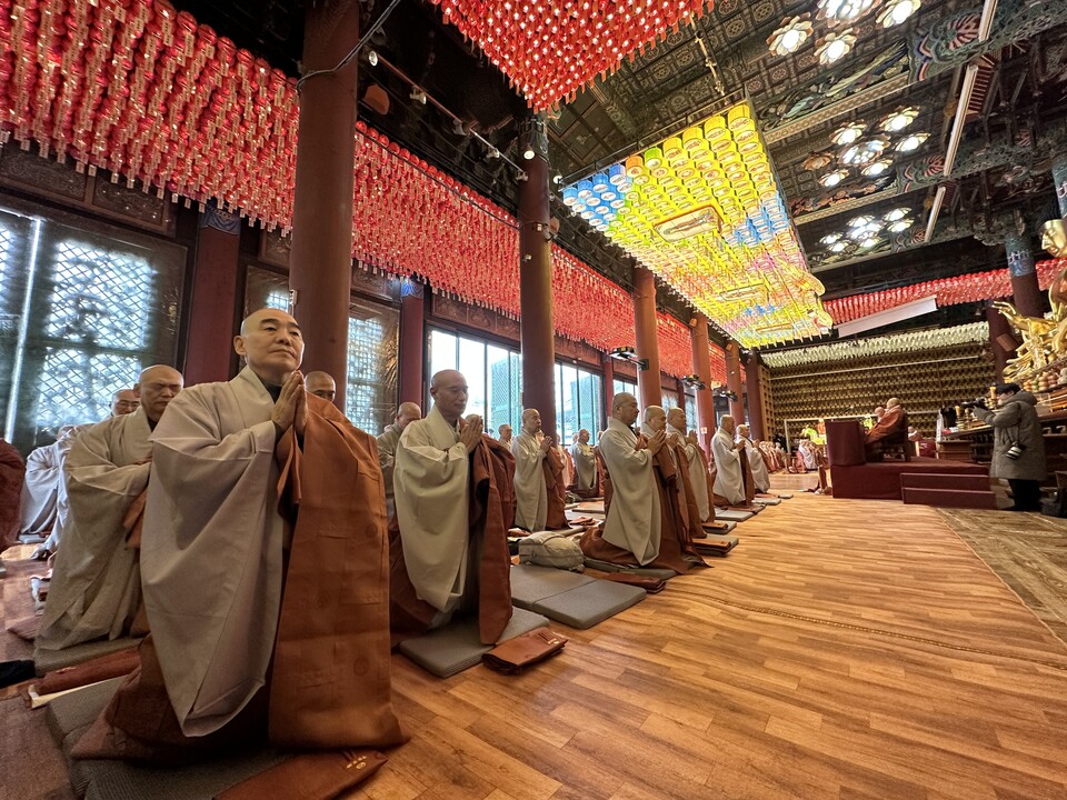 법산대종사와 법계위원 스님들이 증명한 가운데 봉행된 품서식에는 법계증과 함께 종사·명덕 법계를 상징하는 21조 가사가 수여됐고, 스님들은 장궤합장하며 한 목소리로 "종단 발전을 위한 용맹정진"을 발원했습니다.
