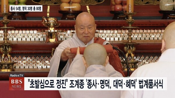 조계종은 오늘(25일) 조계사 대웅전에서 열린 종사·명덕 법계품서식에서 종사 54명, 명덕 30명 등 종사·명덕 법계 특별전형에 합격한 84명의 스님들에게 법계를 내렸습니다.