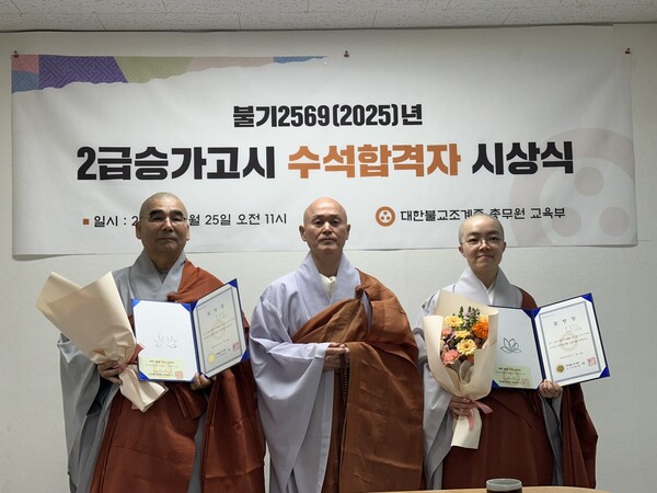 조계종 교육부는 오늘 오전 11시, 불기2569년 2급 승가고시 수석합격자 시상식을 열어 혜원스님과 진석스님에게 표창장을 수여했습니다.