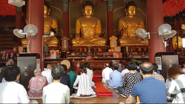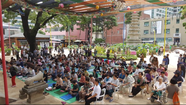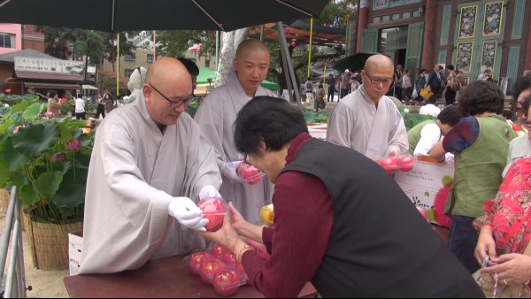조계사 주지 지현스님과 행정 국장 등목스님 등 사중스님들은 신도들의 인연 성취 발원을 염원하고, 신중단에 올린 공양물인 천도복숭아를 2천명의 불자들에게 나눠줬습니다.